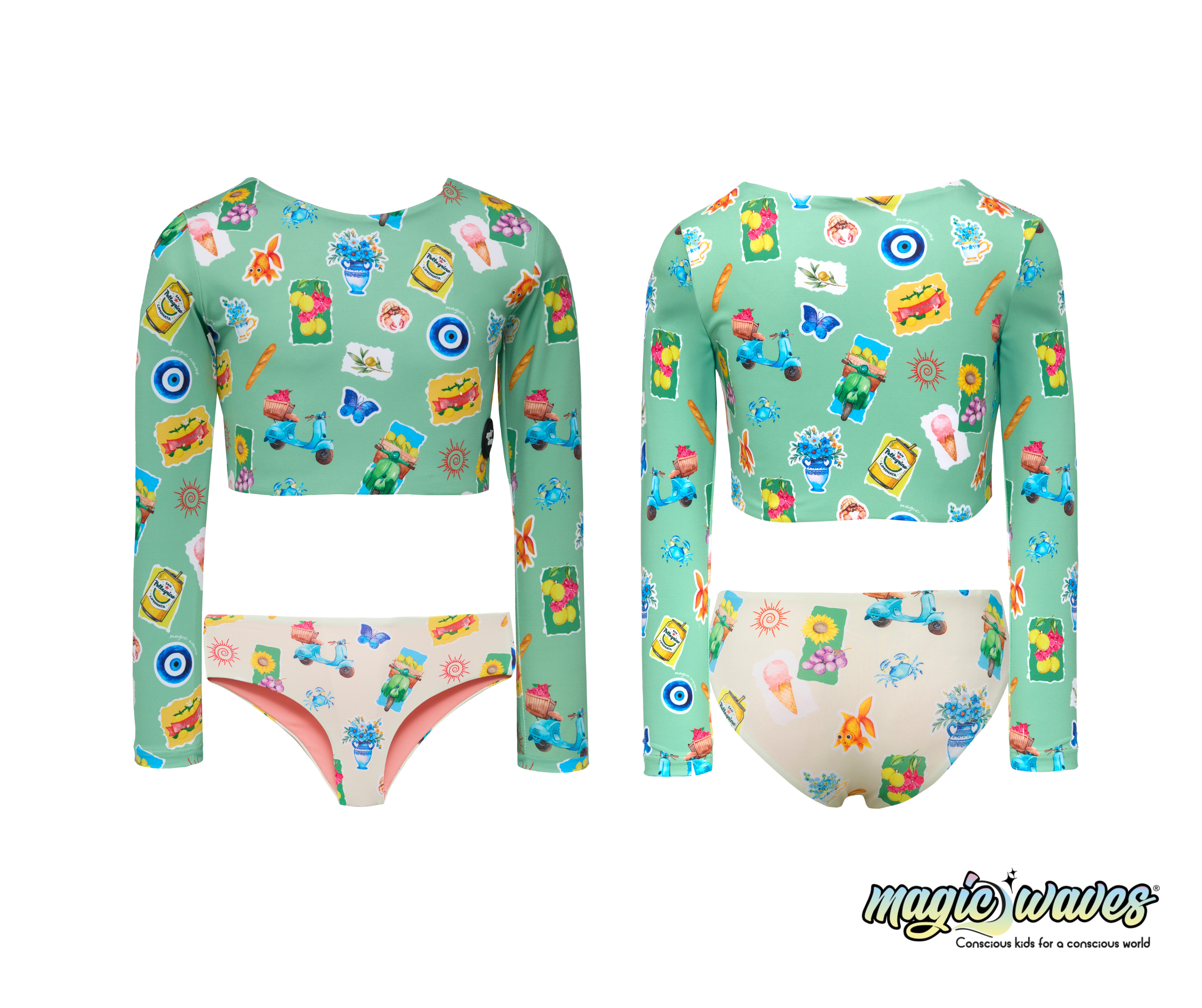El traje de baño de dos piezas MILOS ofrece un estilo fresco y divertido, con estampados que fusionan lo mejor del océano y la naturaleza. La parte superior tipo crop top añade un toque moderno y cómodo, ideal para disfrutar de los días de sol con total libertad. Confeccionado a partir de textiles reciclados de botellas de PET, es una opción sostenible que combina estilo y conciencia ambiental.