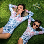 Haz "match" con tu hija y evita los rayos del sol, usando nuestro traje de baño completo para mujer, manga larga con estampado de animal print, además de contar con aplicaciones de Glitter. Tiene cierre frontal a combinación que es muy práctico. Claro, también hecho con nuestro textil a base de botellas de pet reciclado y ¡Lista para entrar a la playa con tu hija!