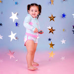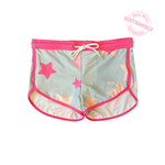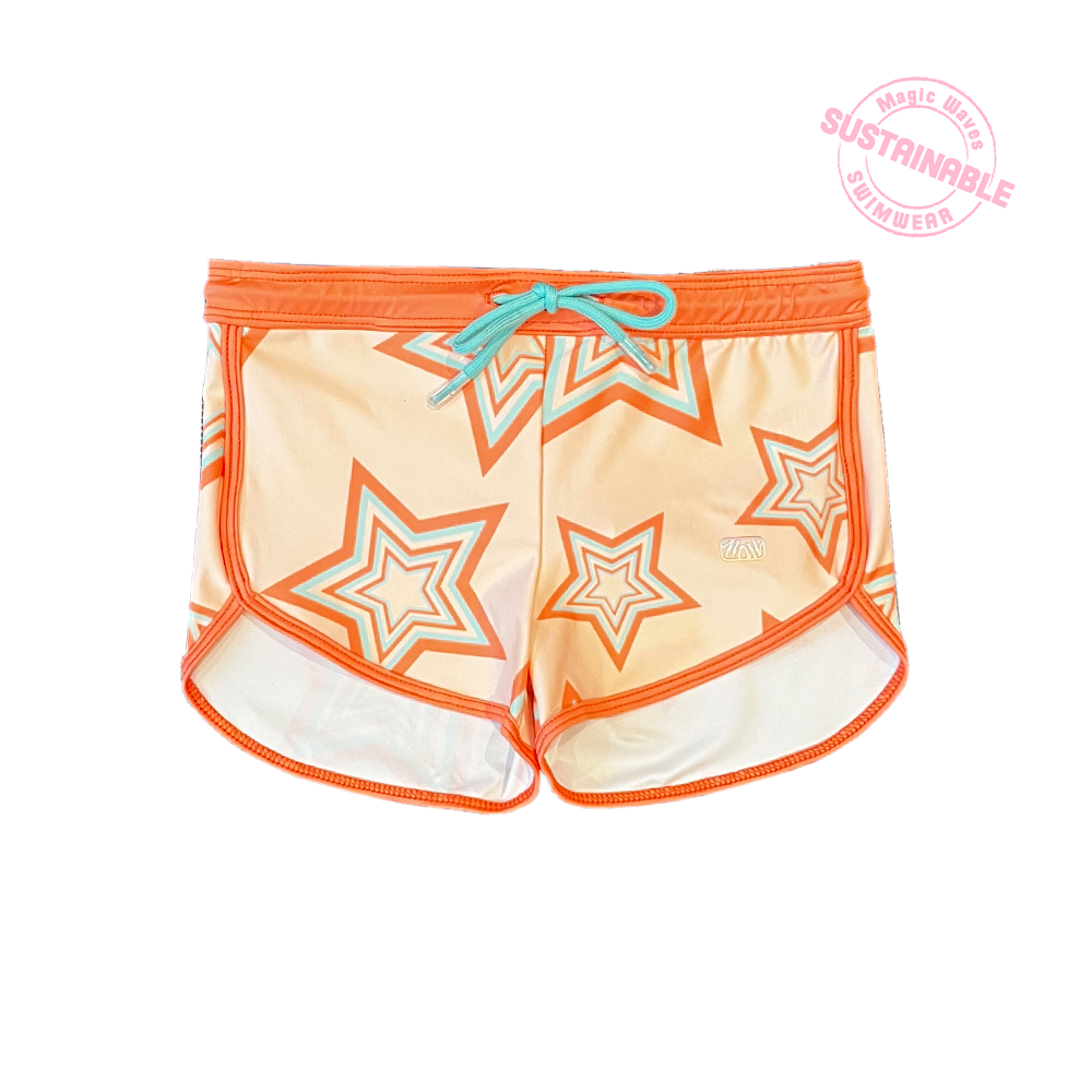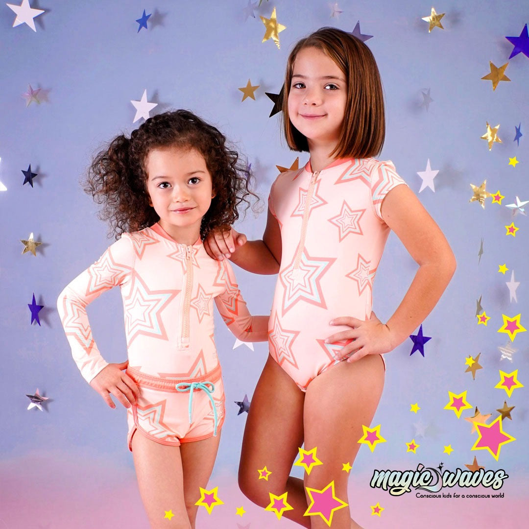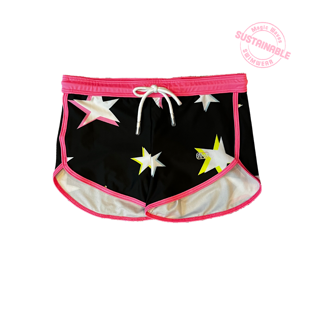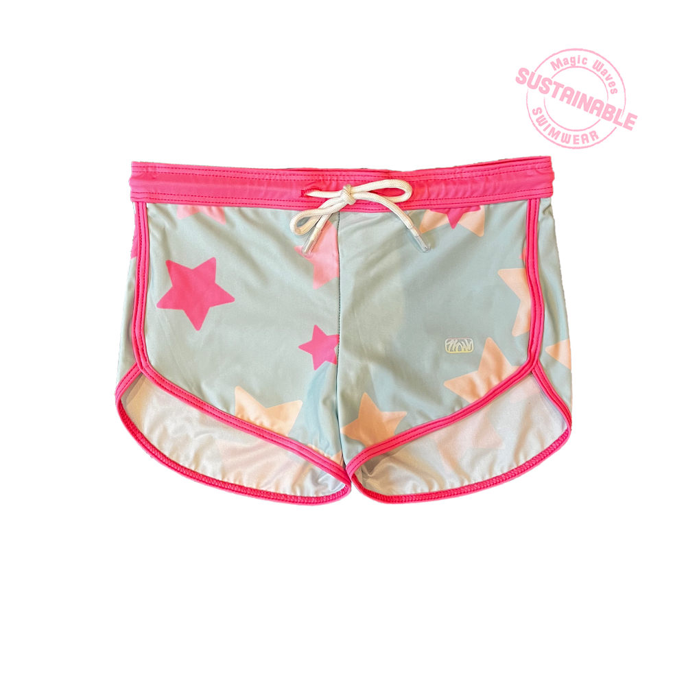 Short para niñas con estampado de estrellas de colores Neón. Perfecto para acompañar con los trajes de baño. Claro, también hecho con nuestro textil a base de botellas de pet reciclado y ¡Lista para entrar a la playa!.