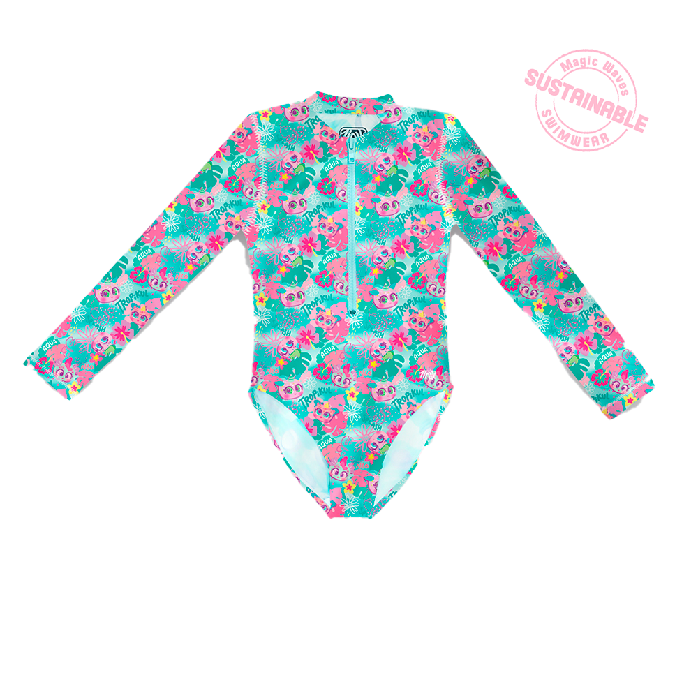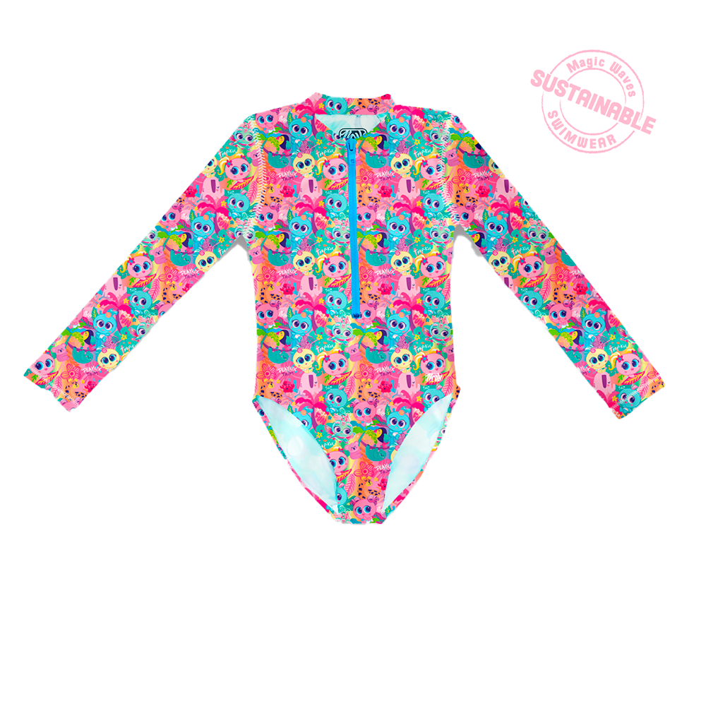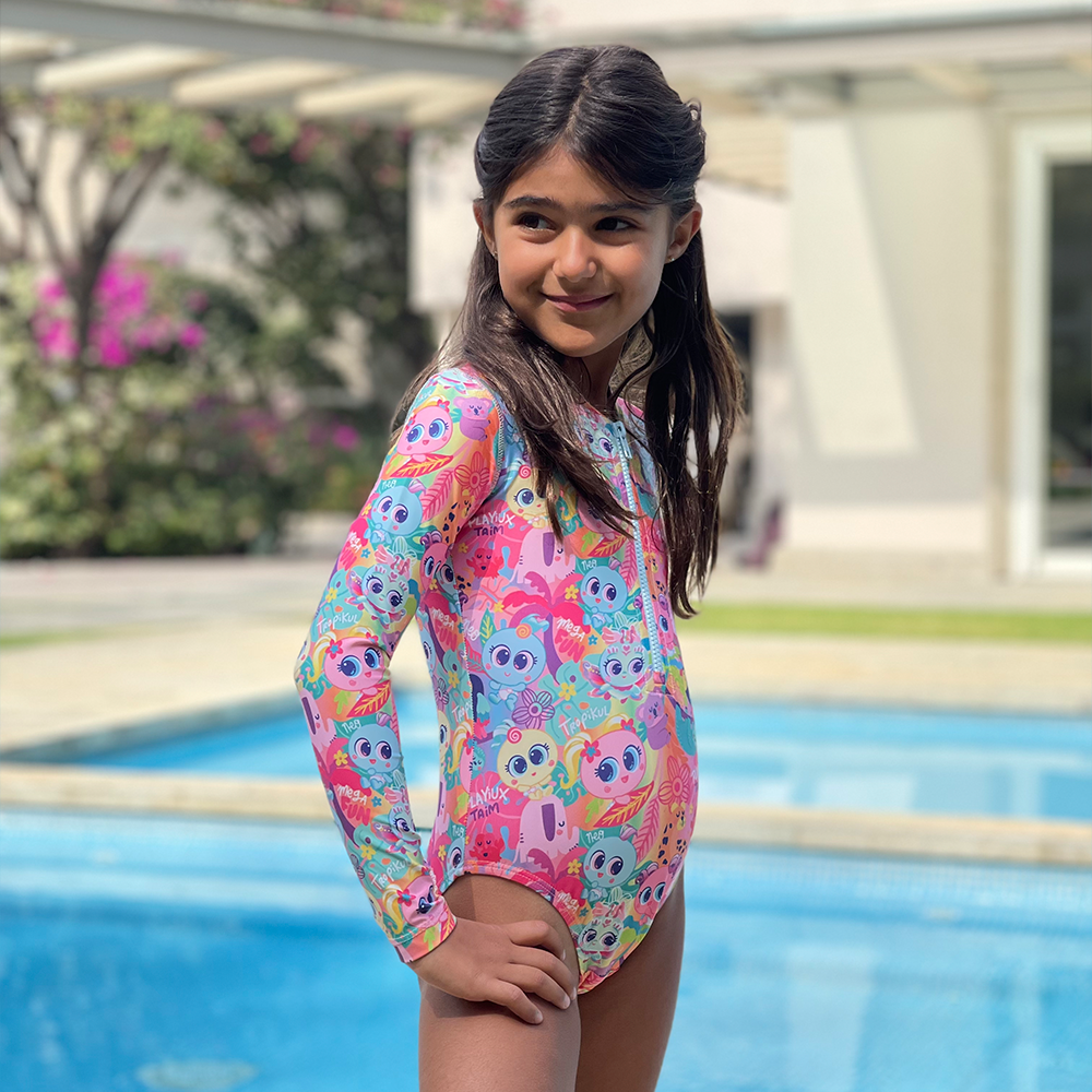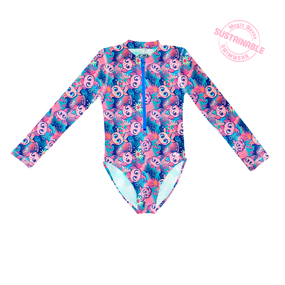 Nuestro traje de baño de manga larga para niñas MARBELLA, ahora viene con los Aquameritos y Neonatos, divertidos gráficos que acompañaran a nuestros niñas en su chapuzón. Tiene cierre frontal a combinación que es muy práctico. Hecho con nuestro textil a base de botellas de pet reciclado. ¡Lista para entrar a la playa o alberca!